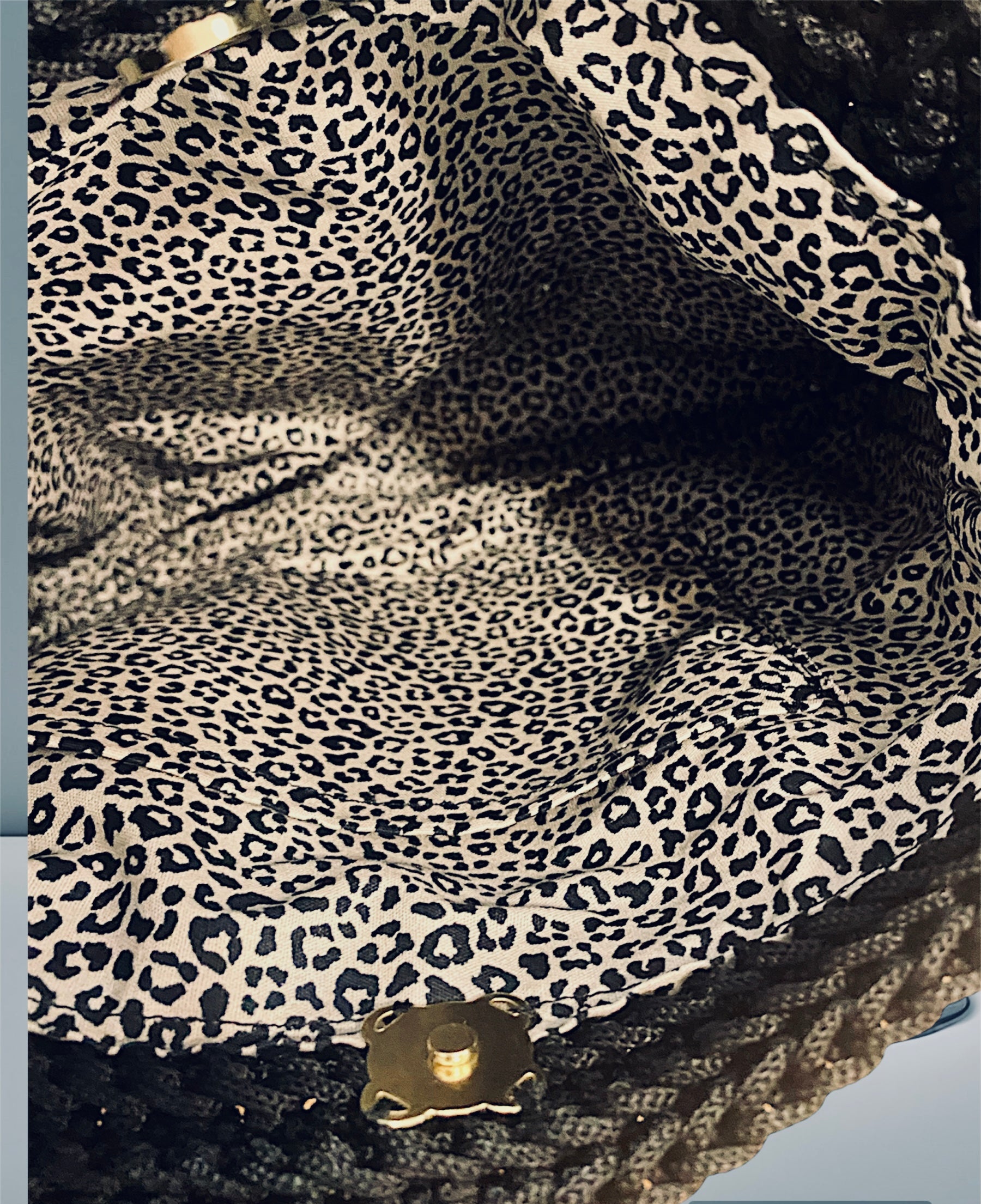 Sac trapèze fil noir , doublé coton imprimé léopard , poche intérieure.